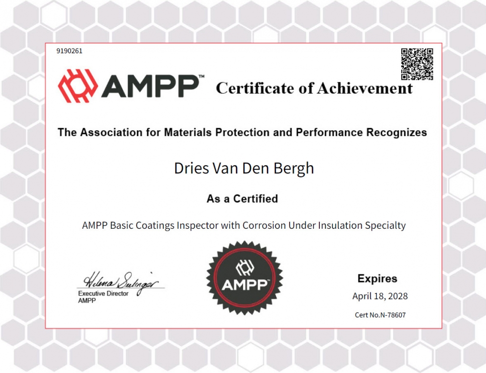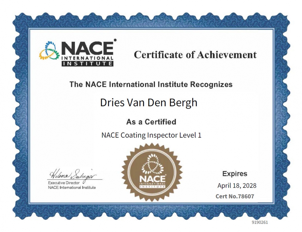 Sinds 2019 is Dries Van den Bergh gecertificeerd NACE CIP Level 1 Coating inspecteur met een "Corrosie onder Isolatie" specialisme (cert. 78607, geldig tot 18 April 2028). NACE "Corrosie onder Isolatie" (C.U.I.) cursus is in 2019 succesvol gevolgd.